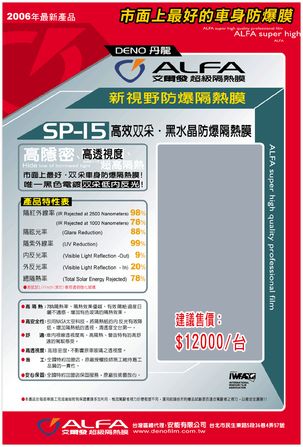 | ALFA SP-15 | 12% | 78% | 99% | 改良深色真空激濺電鍍膜,升級成低內反光,顏色變淺,隱密性變差,隔熱變差的缺點,維持深色隱密功能,但清晰度、安全性更佳之最新科技產品。 | 12,000/台 |